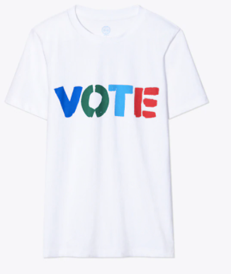 The limited-edition Tory Burch Vote T-Shirt was created to urge all Americans to participate in our democracy and vote in November. Help spread the #ownyourvote message — registering and voting has never been more important than it is now.100% of net proceeds will benefit I am a voter., a nonpartisan initiative that aims to increase voter participation nationwide.
