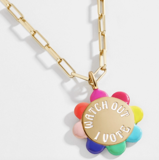 Ten percent of all proceeds from this cute “Watch Out I Vote” necklace will be donated to I am a voter.